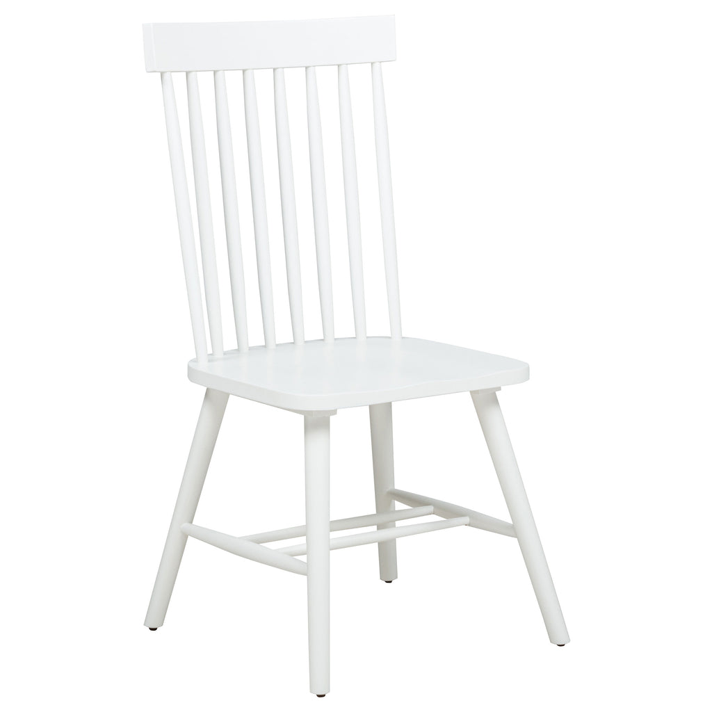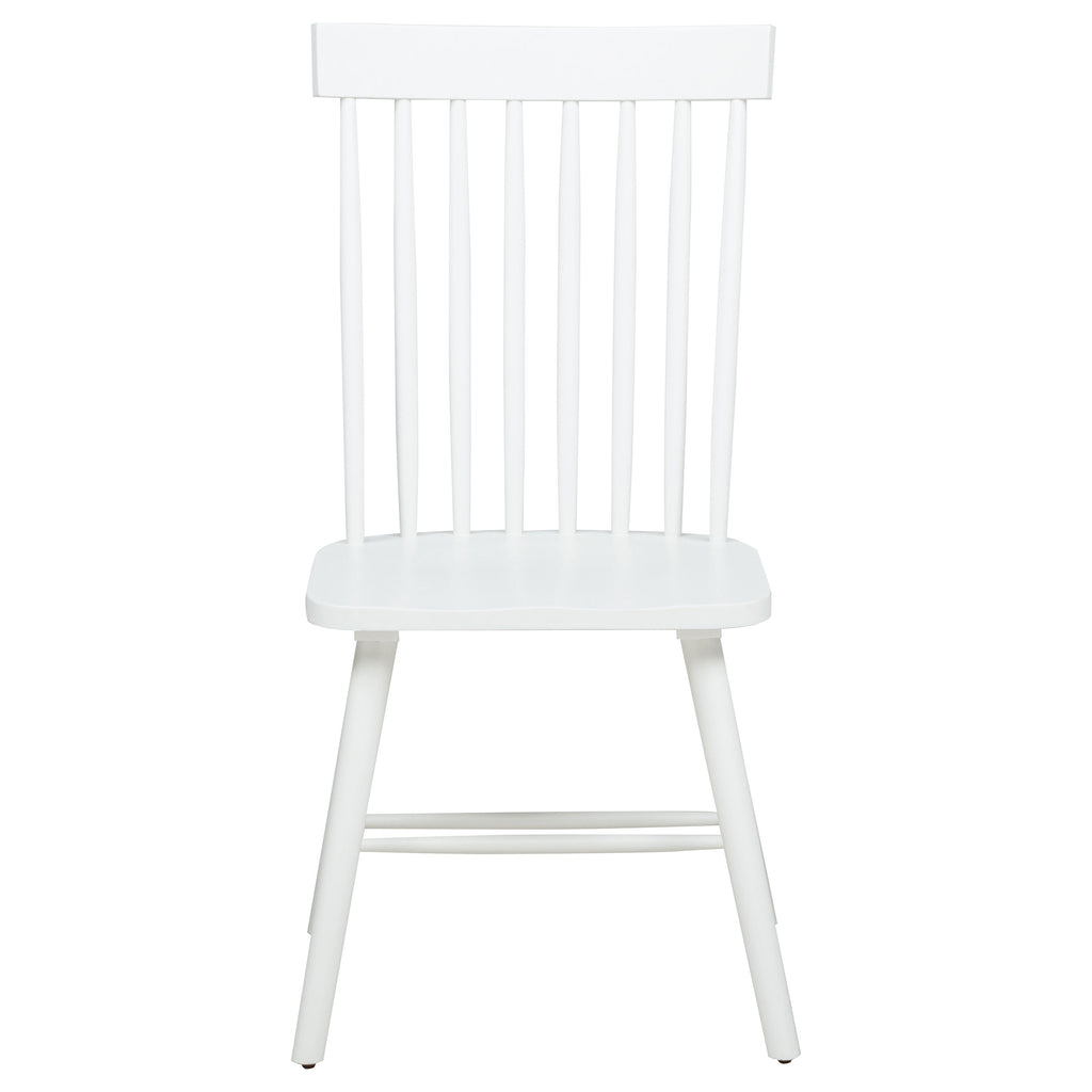Graceful and inviting, this dining set blends timeless charm with gentle mid-century influence. A round table with tapered legs anchors the room, while Windsor-style side chairs feature high spindle backs and curved seats for enduring comfort. Each piece is crafted from solid rubberwood with ash veneer over engineered wood, highlighting soft wood grain throughout. Perfect for cozy breakfast nooks, casual kitchens, or intimate dining spaces. Key Features: • Dining set with round table and chairs in light ash finish blends timeless form and function • Smooth tabletop and tapered legs lend airy elegance with a subtle retro-inspired feel • Windsor-style side chairs feature tall spindle backs and gently contoured wooden seats • Angled legs and dual stretchers on chairs enhance durability and balanced proportions • Crafted from solid rubberwood, ash veneer, and engineered wood for long-lasting use • Light ash wood grain offers a natural finish that complements various dining interiors