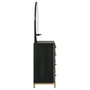 Step into a world of understated elegance with the mid-century modern eight-drawer dresser, its wire-brushed sand wash finish providing a serene backdrop to the aged brass accents. The sleek design, with softly rounded corners and slender legs, offers a sophisticated aesthetic while ensuring ample storage. The felt-lined top drawers cater to your delicate belongings, blending functionality with thoughtful design. Above, the modern dresser mirror, complete with a built-in tray and spacious round reflection, maximizes your space, allowing for a clutter-free surface and a tranquil bedroom escape.