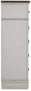 Traditional design. Casual appeal. You can have it all with this chest of drawers. A relaxed two-tone aesthetic merges with ornate profiled drawer fronts and pilasters to give the distinctive piece an allure all its own. Expansive drawers with quality dovetail construction and dark bronze-tone hardware reflect attention to detail from the inside out.