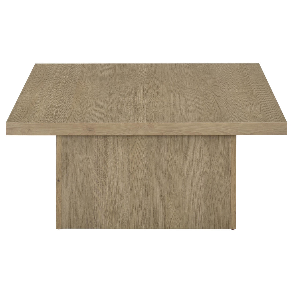 Natural ambiance brings a fresh motif to your casual spaces in the form of a square wood coffee table with the power to change up a design scheme. The square coffee table reflects a heady natural vibe with wood grain markings on natural mango finish wood products construction. Its spacious overhang top and oversized block base create delightful optical effects with a low-key feel. Centered in a casual yet elegant room, it speaks to your signature organic design statement. Experiment with suitable ensemble pieces to make the rustic look of this cocktail table a main factor. Key Features: • Square coffee table made from engineered wood with laminate veneer for durability • Features a natural mango wood look with visible grain markings for rustic charm • Spacious overhang top provides plenty of room for display and functionality • Oversized block base adds to the table's sturdy and balanced design • Eco-friendly laminate veneer offers a scratch-resistant surface for longevity • Ideal for casual, rustic interiors seeking a natural and understated aesthetic