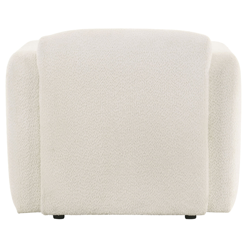 This modern accent chair brings sculptural softness and deep comfort to any living space. Wrapped in a richly textured fabric, its rounded frame flows from low-profile back to wide track arms with effortless ease. Plush foam cushioning and pocket coil seating deliver the ideal blend of sink-in softness and lasting support. With its minimal silhouette and gentle curves, this chair adds a cozy yet elevated presence to any room. Key Features: • Accent chair with sculpted form and rounded silhouette for modern minimalist appeal • Textured white fabric upholstery adds warmth and visual depth to any room • Curved track arms and low-profile frame create a cocoon-like seating experience • High-quality foam cushioning ensures soft comfort and inviting relaxation • Pocket coil seating provides lasting support and maintains its shape • Ideal as a standalone lounge chair or cozy addition to a modern seating arrangement