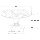 Create a warm and inviting space for family meals with a five-piece traditional dining set. It centers on a stylish wooden dining table with a round top. Its decorative pedestal and rustic smoke finish create a stylish look and feel, perfect for a refined home. The set includes four upholstered side chairs, each with a tall back for impeccable comfort and support. Oatmeal colored fabric upholstery is stylish but neutral enough to complement in any setting, while button tufting adds classic dimensionality.