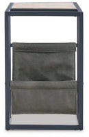 Casual contemporary design with a clean silhouette. That's the beauty of this chairside end table. Quality crafted with elm veneer, its tabletop is finished in a light natural wood tone that lends a fresh, organic look. Cool metal C-frame in a matte black finish and a hanging magazine basket made with a durable brown faux leather coordinate beautifully with the less-is-more profile.