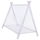 This twin-size tent bed brings a playful touch to any bedroom while offering practical comfort. Crafted from heavy-gauge metal with a powder-coated pink finish, the frame features a charming tent-style design. The included sheer fabric canopy drapes over the structure, creating a cozy retreat. Its platform base supports a mattress without the need for a box spring, ensuring a low-profile look while maintaining sturdy support.