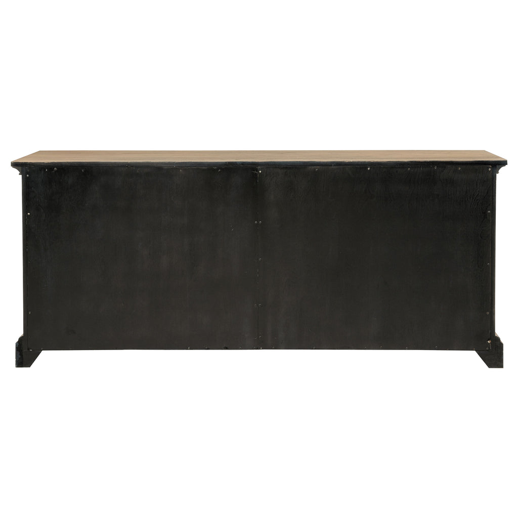 Combining beauty with purpose, this four-door dining sideboard delivers generous interior storage wrapped in timeless style. Behind each antique mirrored door are adjustable shelves, ideal for keeping serveware, linens, or entertaining essentials neatly organized. The barley brown finish brings warmth and texture to its classic silhouette, while matte black hardware adds contrast and sophistication. Crafted from solid rubberwood, engineered wood, and ash veneer, this piece embodies enduring elegance and practicality. Key Features: • Dining sideboard features four antique mirrored doors with adjustable interior shelving • Ample cabinet space stores dinnerware, linens, and entertaining essentials • Barley brown wood finish offers warmth and refined transitional appeal • Matte black hardware creates a striking accent against the light-toned frame • Crafted from solid rubberwood, engineered wood, and ash veneer for strength • Ideal buffet cabinet for dining rooms seeking functional and elegant design