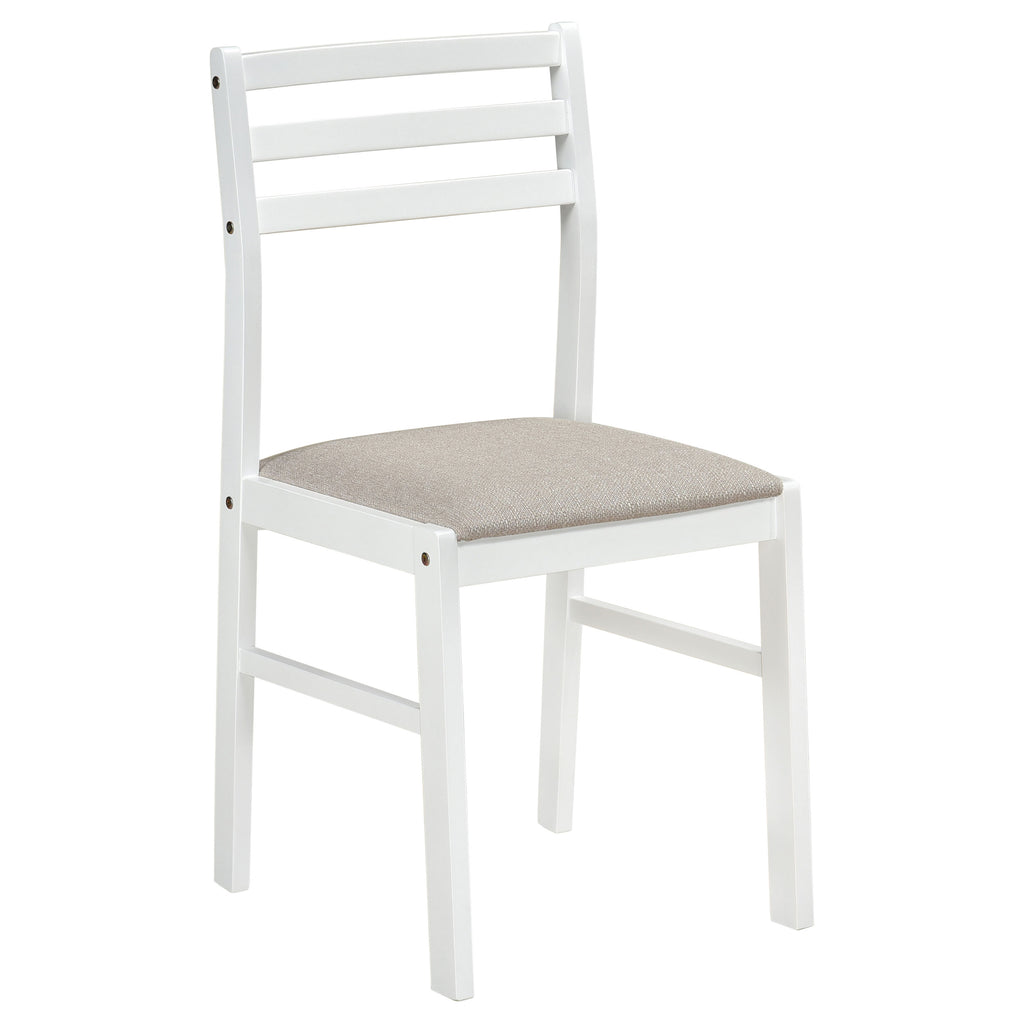 This lovely dining set lends an elegant touch of simple sophistication to a kitchen or breakfast nook. It comes complete with a lovely, round dining table and two comfy chairs upholstered in soft, light brown, padded fabric. The table is enhanced by a versatile drop-down extension which can be raised to accommodate an elaborate dining setup. Lowering it allows you to cozy up closely with a special someone over a leisurely breakfast or romantic, candlelit meal. A smooth, polished, natural wood finish gracefully complements the sleek, stylish silhouette of this beautiful three-piece set. Key Features: • Light and airy natural finish dining set is perfect for a casual breakfast nook • Round table with drop down leaves saves space • Chairs feature a contemporary rendition of a ladder back style • Padded seats in tan microfiber • Sold as a three piece all-inclusive set: Table plus two chairs