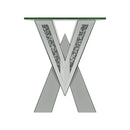 This mirrored end table brings a bold, artistic flair to any living space. Its striking V-shaped base features mirrored panels and glittering crystal accents, creating a glamorous and reflective design. Topped with a square, beveled tempered glass surface, this piece offers a perfect blend of style and functionality. The sculptural silhouette makes it an eye-catching focal point for modern interiors.