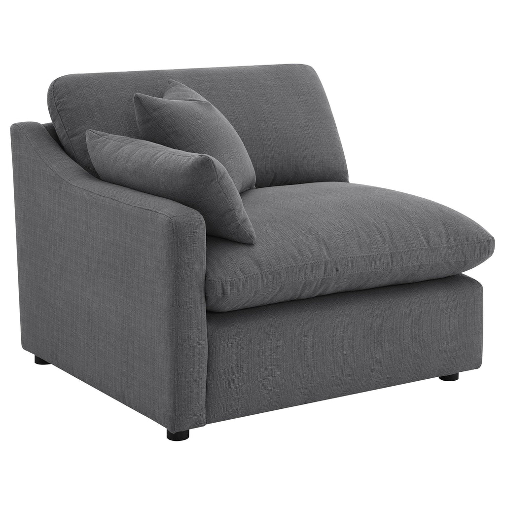 This modular sectional sofa blends modern style with luxurious comfort. Upholstered in soft performance fabric, it features feather blend-wrapped box cushions with reversible seating and backs for lasting support. Tailored topstitching and slim track arms create a sleek contemporary look, while plush accent pillows enhance comfort. Treated fabric resists moisture, allowing for easier maintenance and everyday durability. Designed for lounging, this sectional offers both elegance and versatility. Key Features: • Six-piece sectional in ivory fabric with slim track arms and tailored topstitching • Reversible seat and back cushions with feather blend filling provide soft comfort • Moisture-repellent treated fabric simplifies cleaning and everyday maintenance • Ottoman with plush cushion functions as footrest, coffee table, or extra seating • Accent pillows included to enhance comfort and complete the sectional design • Durable frame construction ensures strength and long-lasting living room use