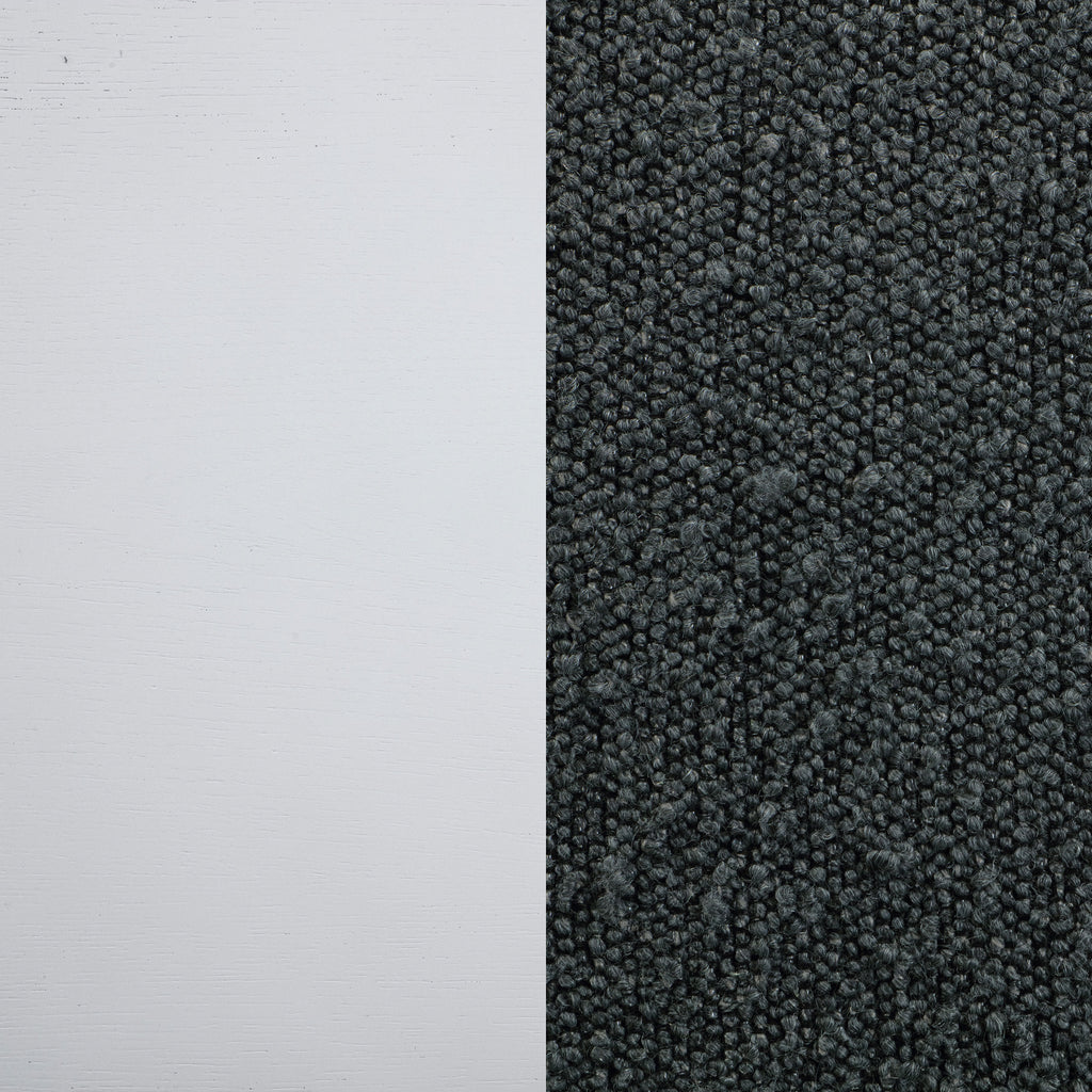 Embrace a modern minimalist presentation with this contemporary dining set. It centers on a roomy round dining table that seats four to six, with flared legs and a round shelf that adds stability and decorative potential. The set adds side chairs, each with a tall, structured silhouette and dark grey upholstery over plush foam cushions. A pearl white finish is clean and fresh, offering plenty of contrast against the grey. The set instills a clean, precise aesthetic, perfect for minimalist or maximalist decor themes. Key Features: • Simple, clean aesthetics define these modern side chairs for your kitchen or dining room • Crisp pearl white finishing creates a clean, airy ambiance perfect for spaces large and small • Dark grey upholstery over foam cushioning creates ample comfort and stylish contrast and depth • Flared legs add visual interest and are unified with a round shelf on the table • Set is crafted from durable and strong rubberwood, engineered wood and oak veneer