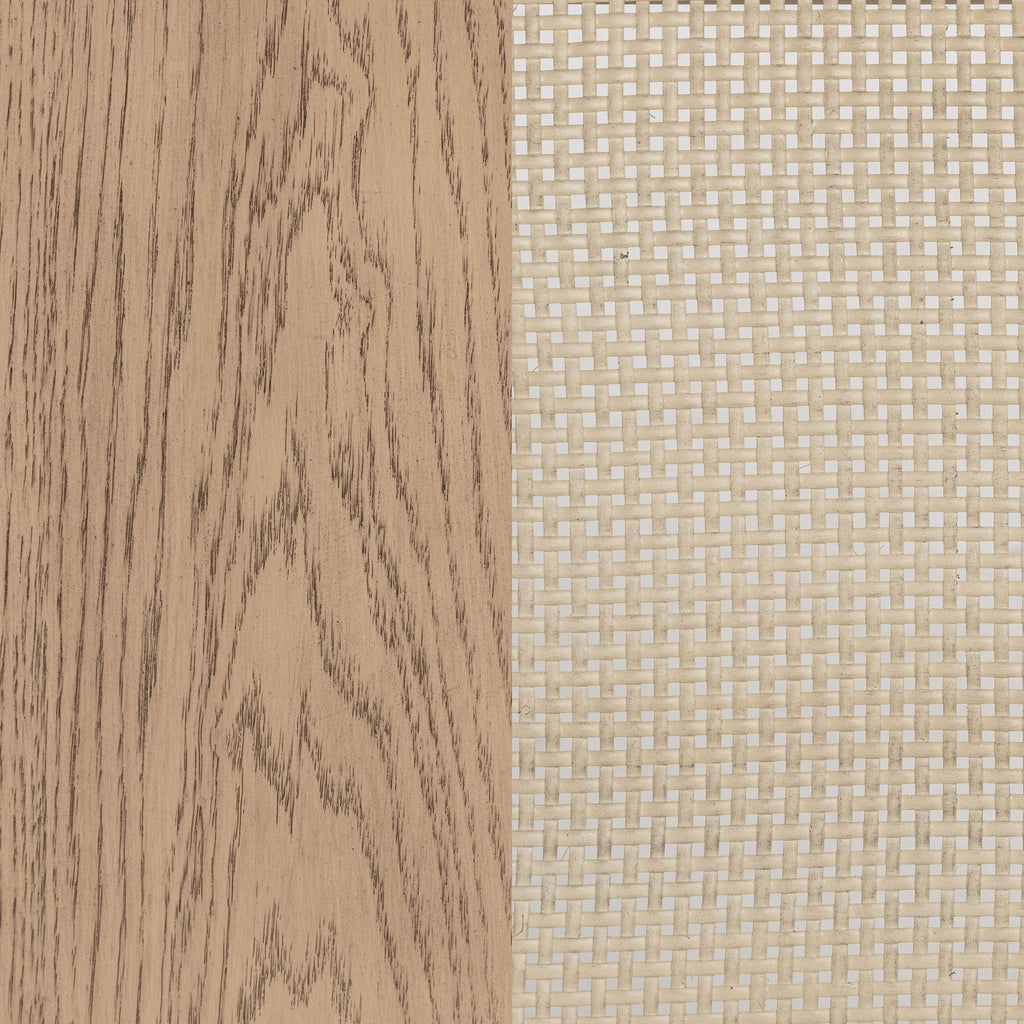 Elevate your space with this sophisticated vitrine cabinet, designed to showcase your most treasured items with style. Featuring two wood-framed tempered glass doors, the upper section offers four tiers of shelving, perfect for displaying decor, dinnerware, or collectibles. The lower section of the cabinet provides additional storage with two hand-woven cane doors and a shelf inside for hidden organization. Crafted from solid wood, engineered wood, and oak veneer, this display cabinet offers both open display and concealed storage options. Its timeless arched design and natural wood finish make it a perfect addition to dining rooms, living spaces, or home offices. Key Features: • Elegant beige oak vitrine cabinet with arched design and wood-framed tempered glass doors • Four tiers of shelving in the upper section for showcasing decor or dinnerware • Lower two-door cabinet with a shelf for concealed storage • Crafted from solid wood, engineered wood, and oak veneer for durability • Hand-woven cane doors in the lower section add a natural, artisanal touch