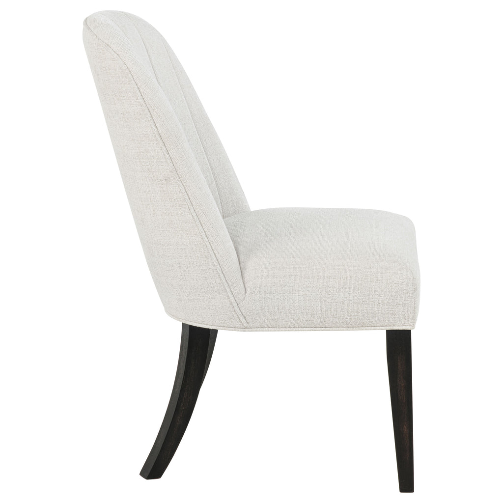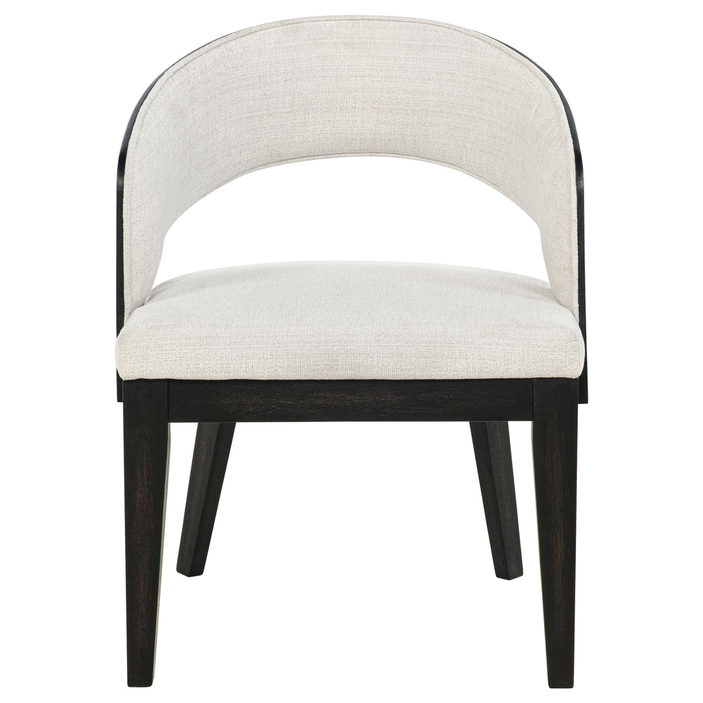 Gather in grounded elegance with this dining set, where sculptural form and graceful texture meet. A bold round pedestal table anchors the space in a burnished black finish, its open base and soft curves inviting conversation and connection. Surrounding it, barrel-back arm chairs cradle each guest in cream fabric and cushioned ease. From candlelit evenings to morning rituals, this set is a quiet celebration of balance, beauty, and belonging. Key Features: • Dining set features a burnished black pedestal table with curved edges and open base • Cream upholstered arm chairs offer barrel-back support and sculptural comfort • Soft flared frames and cushioned seats create an inviting, elevated dining experience • Round table silhouette encourages connection in intimate and open spaces alike • Crafted from rubberwood, ash veneer, engineered wood, and textured fabric • Modern organic styling blends strength, flow, and warmth in a unified setting