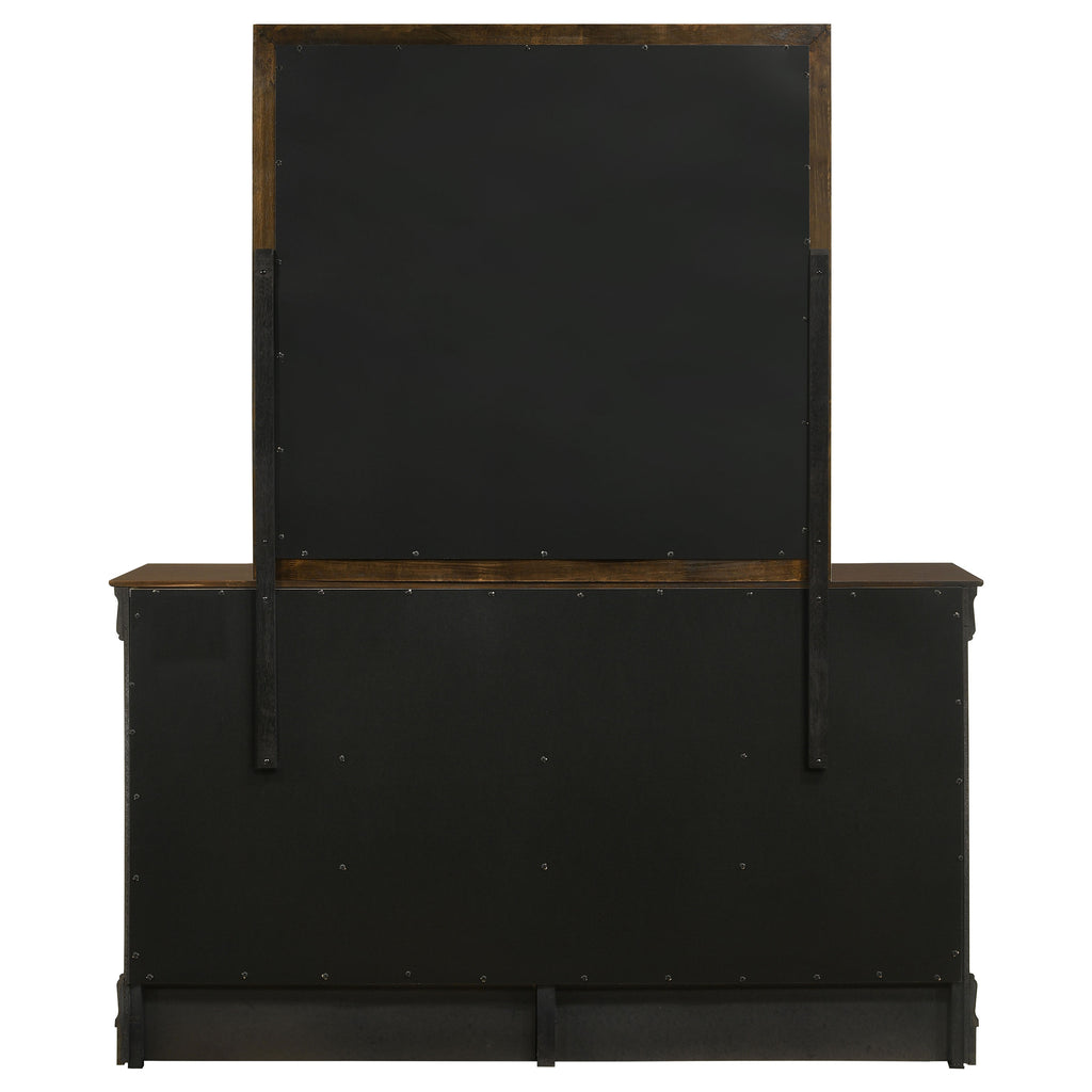 Enhance your traditional decor with this polished six-drawer dresser, showcasing simple and elongated details in a warm cappuccino finish. The contrast between the deep wood hue and nickel bail drawer handles radiates classic style and sophistication, while the exposed wood grain adds extra dimension. Crafted from wood veneer and select hardwoods, this dresser features dovetail drawer construction for stylish and durable storage. Complement it with the sleek rectangular mirror, its thin clean lines and cappuccino finish adding depth and balance to your bedroom, refining the space with its charming wood veneer and select hardwood construction. Key Features: • Six-drawer dresser with elongated details in warm cappuccino finish • Exposed wood grain for added dimension and classic appeal • Nickel bail drawer handles contrasting with deep wood hue • Crafted from wood veneer and select hardwoods for durability • Sleek rectangular mirror with thin lines and cappuccino finish