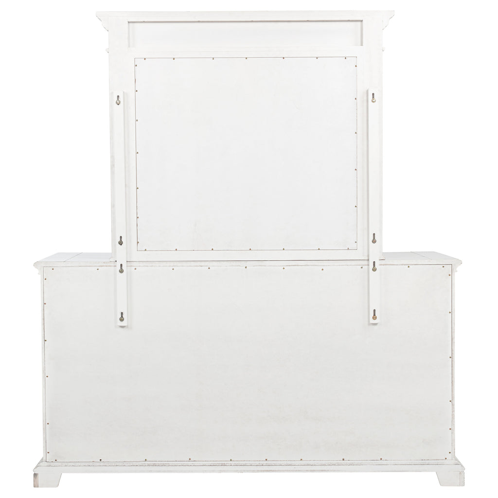Rooted in traditional elegance, this dresser and mirror set brings vintage charm and refined detail to the bedroom. Framed with ornate carvings and softened by a distressed white finish, the six-drawer dresser offers ample storage with thoughtful touches—including a hidden jewelry tray in the bottom drawer. Antique bronze pulls and crown molding complete the look. Crafted from poplar and engineered wood, it’s designed with both beauty and function in mind. Key Features: • Six-drawer dresser and mirror set with ornate trim and traditional crown molding • Vintage white finish offers aged character with soft, antique-inspired appeal • Antique bronze drawer pulls provide contrast and decorative visual weight • Bottom drawer includes hidden jewelry tray for organized, concealed storage • Felt-lined top drawers and smooth glides add elevated function to daily use • Crafted from poplar, engineered wood, and mirrored glass for enduring charm