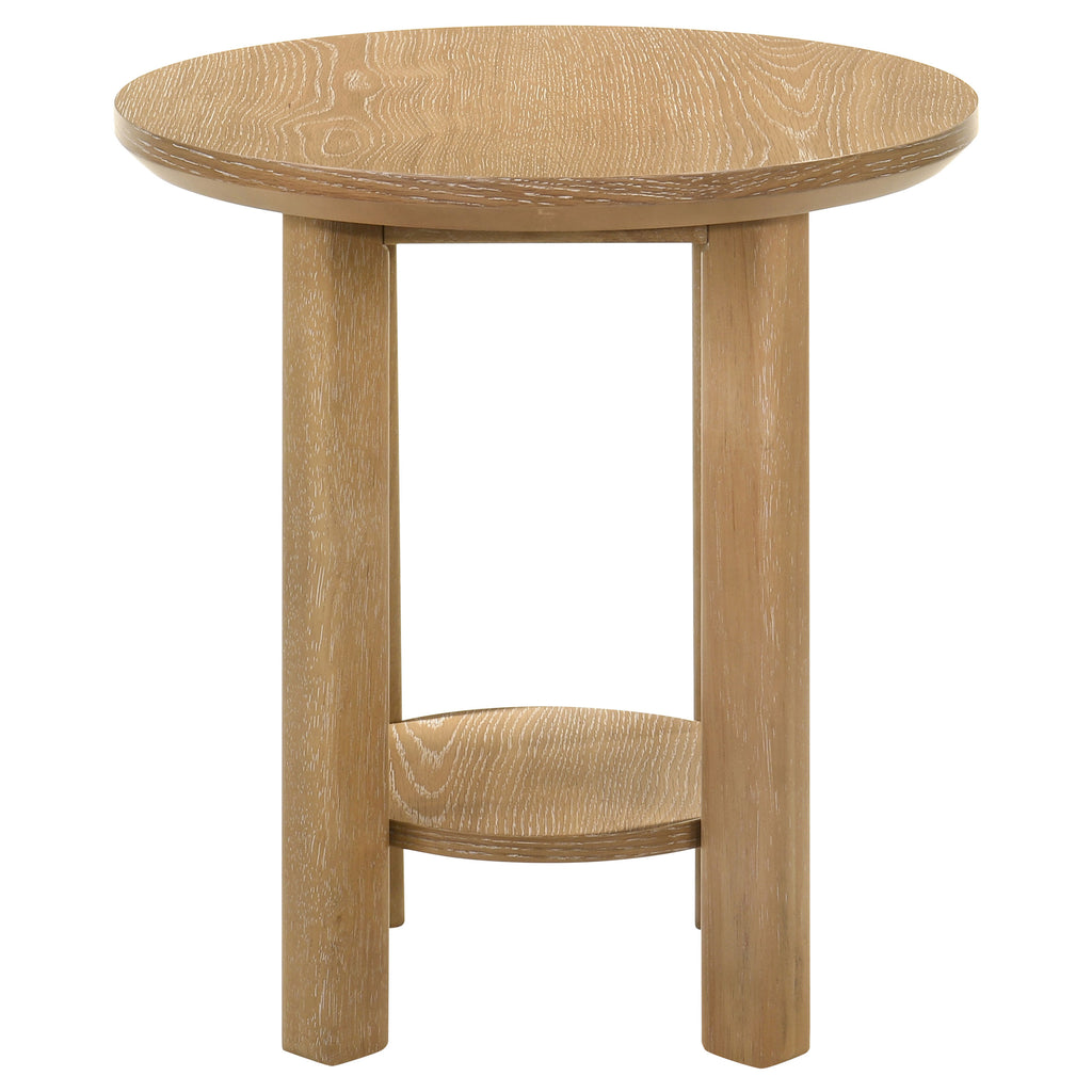 Gracefully curved and richly grounded, this end table brings sculptural elegance to any living space. A smooth, round top floats above four cylindrical legs, creating a gentle rhythm of form and function. Below, a low circular shelf adds space for cherished objects or everyday essentials. Crafted from solid wood, engineered wood, and white oak veneer, this accent table offers quiet strength and warm simplicity beside any chair, sofa, or reading nook. Key Features: • Round end table with sculpted legs and shelf for functional and balanced living room use • Washed oak finish brings soft tone and subtle wood grain to the circular surface and shelf • Cylindrical legs add visual structure and grounding to the smooth round profile • Lower open shelf offers added space for books, décor, or small storage baskets • Crafted from rubberwood, engineered wood, and white oak veneer for strength and warmth • Ideal as an accent or side table for relaxed spaces with casual modern appeal