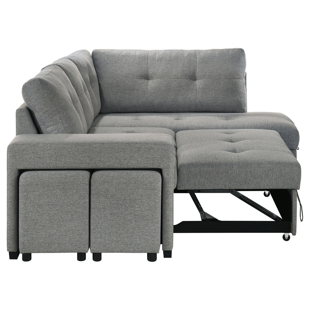 Effortlessly blending beauty and utility, this sleeper sectional invites you to unwind in tailored comfort. Draped in soft grey fabric, its tufted cushions exude quiet elegance, while the generous silhouette offers space to stretch, gather, or dream. Two upholstered stools nest neatly within the armrest, ready for extra seating in an instant. A pull-out bed welcomes overnight guests, and the chaise conceals spacious hidden storage—perfectly designed for life lived beautifully. Key Features: • Sleeper sectional sofa with tufted cushions and clean lines for stylish relaxation • Grey fabric upholstery brings soft texture and versatile modern charm • Pull-out sleeper bed transforms the sofa into a cozy guest accommodation • Lift-up chaise conceals hidden storage for blankets, pillows, or everyday needs • Includes two upholstered stools that nest seamlessly into the sofa armrest • Perfect for compact spaces needing elegant form, comfort, and flexible seating