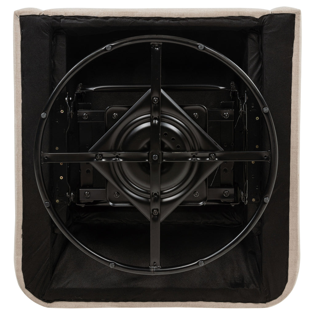 Comfort flows from every angle in this swivel accent chair. With gently sloped arms and a tall, tailored backrest, it wraps the body in a soft, supportive shape. Upholstered in smooth fabric and mounted on a black metal base, it glides with ease to match your movements. Clean edges, plush cushioning, and fluid form blend practicality with understated romance—making it ideal for nurseries, reading nooks, or refined lounge spaces. Key Features: • Swivel accent chair with tall backrest and low-profile silhouette for modern comfort • Upholstered in latte-colored polyester fabric for a soft and versatile neutral tone • Subtly sloped arms flow into the seat for an elegant and supportive arm profile • Smooth 360-degree swivel motion supported by a matte black finished metal base • Padded with supportive foam cushioning for lasting comfort in any setting • Constructed from fabric, foam, metal, and plywood for durability and strength