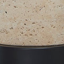 - Made of beige travertine and metal with a metal shade